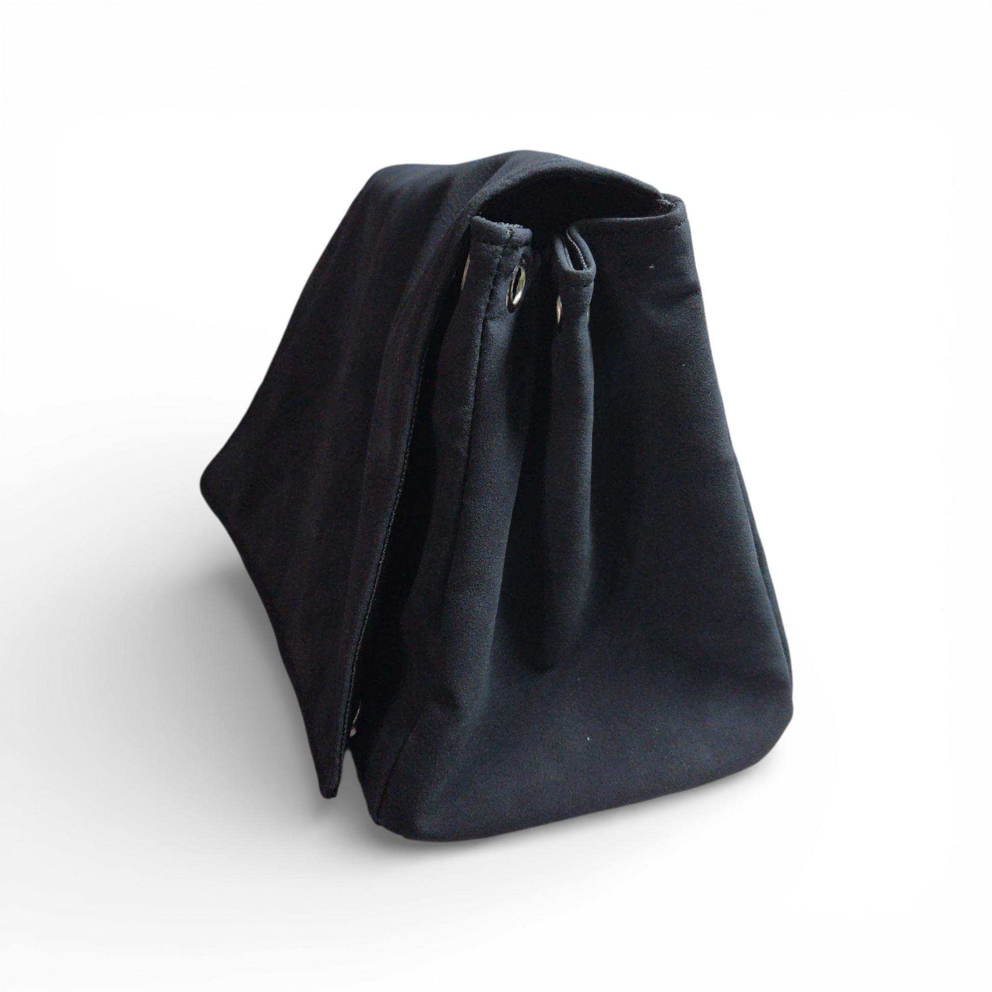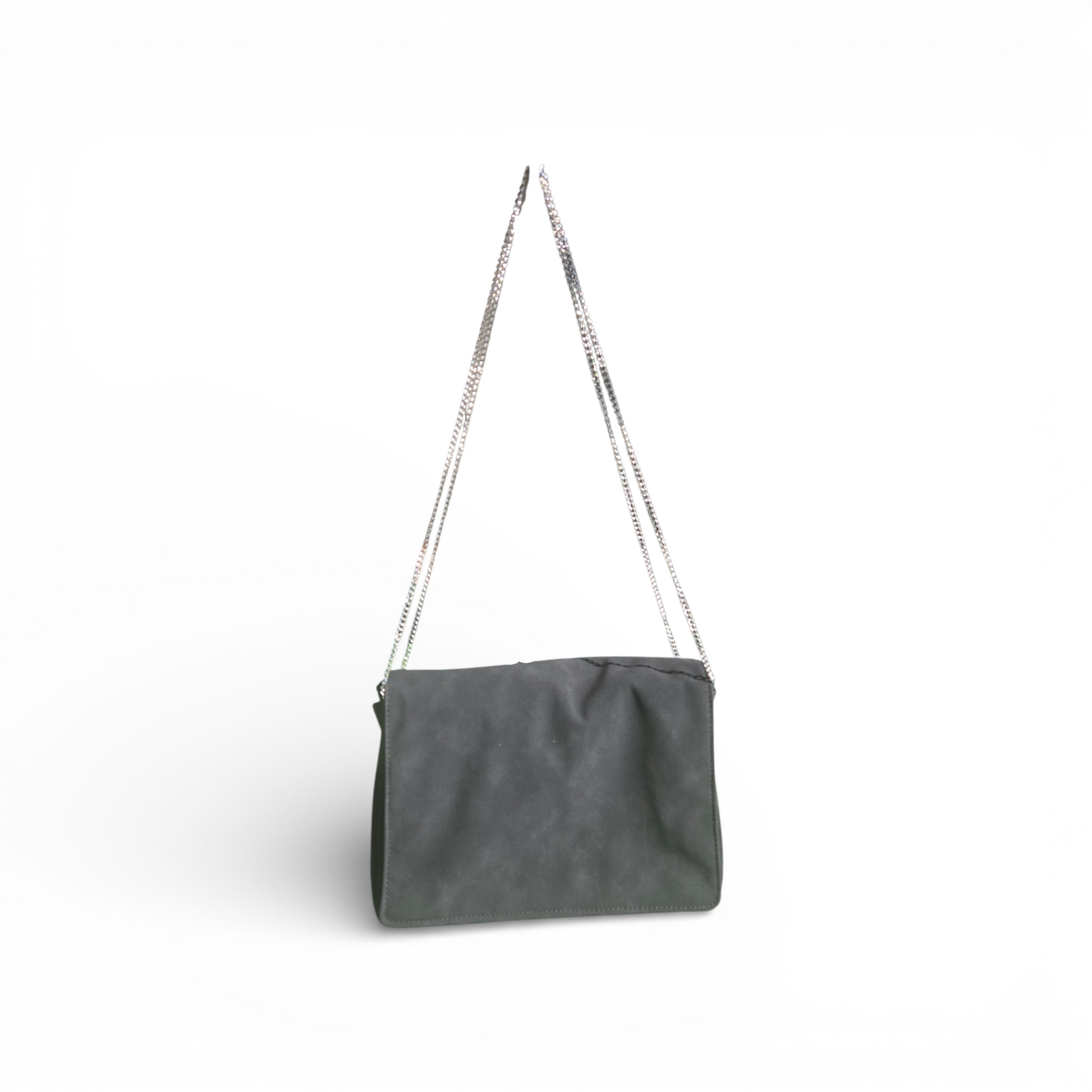 Quietly bold and deliberately constructed, the Saida Flap Bag balances soft texture with architectural detail. Crafted in rich black faux suede, this silhouette is defined by its structured flap, sculptural grommet accents, and a chain strap that adds weight and presence without excess.