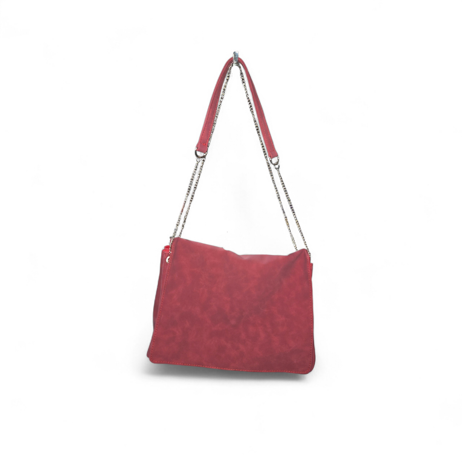 Quietly bold and deliberately constructed, the Saida Flap Bag balances soft texture with architectural detail. Crafted in rich red faux suede, this silhouette is defined by its structured flap, sculptural grommet accents, and a chain strap that adds weight and presence without excess.